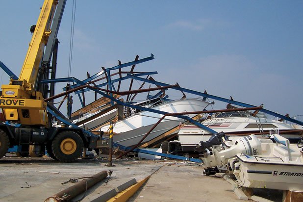 Port Marina, a dry-stack facility in Fort Lauderdale, Florida, has received a lot of publicity for its ability to stand up to winds of more than 140 miles per hour. So, too, have River Forest Yacht Centers in Stuart and LaBelle, Florida, whose dry-stack storage buildings are billed as offering boat owners "safe harbor during hurricane conditions." At the same time these dry-stacks are being touted as one of the best solutions to reducing hurricane damage, other dry-stacks have been among the most visible hurricane casualties. In Hurricane Wilma alone, three large steel storage racks with thousands of boats were collapsed by the storm's 115-mph winds. In Hurricane Ike, a dry-stack facility in Galveston, Texas, collapsed and burned. How old is old? In Florida, construction standards in most counties were upgraded after Hurricane Andrew, which means that newer racks — those built after 1992 — are far more likely to have been built with more (and heavier) structural supports.