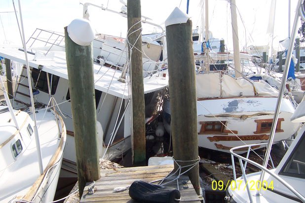 Marinas that are devastated by hurricanes most often choose to rebuild with floating docks and tall pilings, typically 16 to 18 feet tall. Floating docks allow boats to rise and fall with surge without stretching and stressing lines. There have been instances where boats at floating docks have been largely unaffected by hurricanes, while some boats at nearby marinas with fixed docks were badly damaged. If your marina is well sheltered and has floating docks with tall pilings, your hurricane plan may be to strip anything that creates windage and add extra lines.