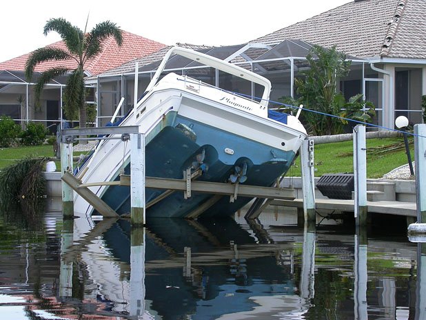 When asked, "Where wouldn't you want your boat to be during a hurricane?" just about all of the BoatUS CAT Team members said they wouldn't want the boat to be on a hoist or lift. Damage to boats on lifts has been high and includes boats being blown off, bunk boards breaking and spilling the boats, boats grinding against motors and pilings, boats being overcome by the storm surge, and boats filling with rainwater and collapsing the lift. Whenever possible, boats on lifts should be stored ashore or moved to a safer location in the water.