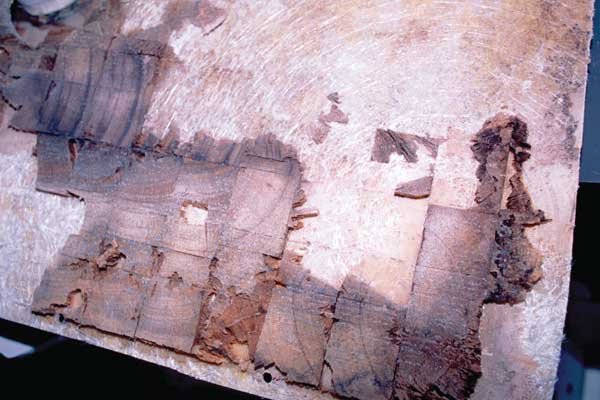 Chainplates are all but impossible to make watertight, so pay special attention there. Not only can a leaking chainplate destroy deck coring, it can rot the structural bulkheads to which they attach below. A rotten bulkhead can give way, releasing the chainplate and bringing the whole rig down. In the case of the 26-foot sailboat above, a leak caused the chainplate to corrode, which made it fail under load. After you finish your deck inspection, go below and look for stains or other evidence of leaks through the deck, keeping an eye out for water-damaged bulkheads.