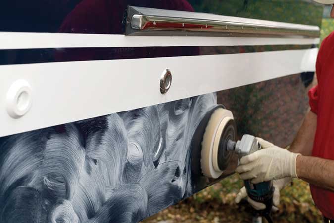 Set the machine to about 2,000 rpm, then place the pad in contact with the surface before pulling the trigger. This prevents the tool from skidding off and you from potentially losing control. Use firm pressure — just enough to keep the full pad surface in contact with the boat. Move the pad from side to side and then up and down in slow deliberate strokes.