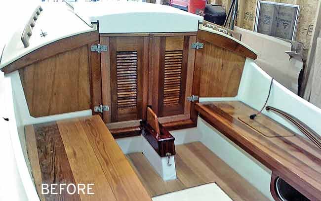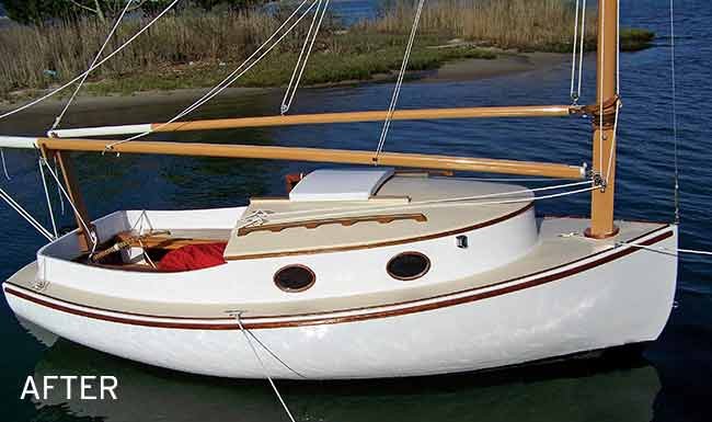 For the last 35 years I've been building and restoring boats, initially as a professional but now, in later years, as an amateur. My projects range from building Hustler speedboats back in the 1990s to restoring theft- and storm-damaged boats. My dad got me interested in boatbuilding back in the 1970s when he bought a 20-foot Gil Smith catboat. The hours and days we spent together keeping that boat floating lit a spark that still burns within me.Online searches brought up an interesting boat, an unfinished hull that was in need of a home and a friend: an 18-foot Herman catboat designed by Charles Whitzhull. She was scratch-built from plans supplied by the Wooden Boat Store. She is cold-molded with three layers of veneers sheathed with fiberglass cloth and epoxy. A guy in Kansas, who sadly passed away when the boat was only half complete, started the building of Cathern. After his passing, the hull sat for a while and the elements took their toll. While the hull was intact, the cockpit wasn't and required some serious rebuilding. I worked out a deal with the owner's widow and had the boat shipped east to my shop in New York.